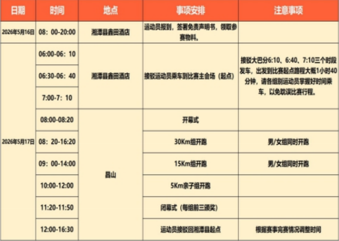 比赛时间地点规模: 时间:2026年05月16日/2026年05月17日 报道地点:湘潭县鑫田国际大酒店 比赛地点:石鼓镇昌山 规模:700人